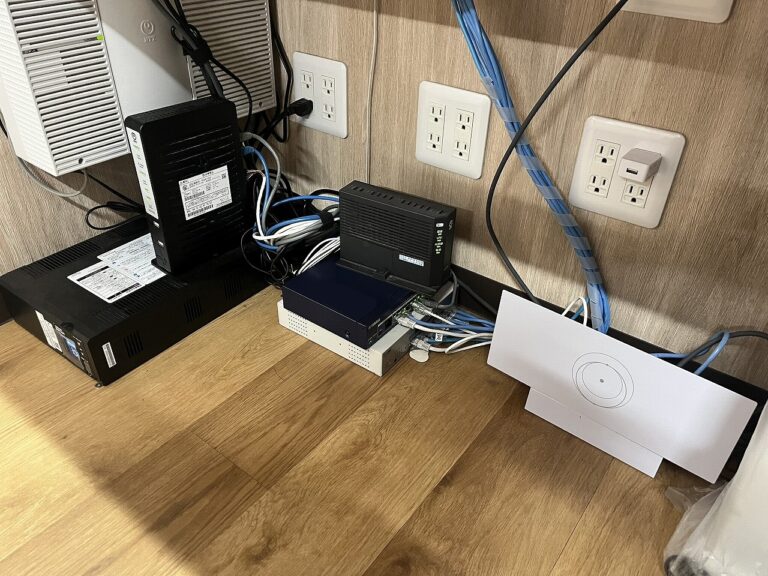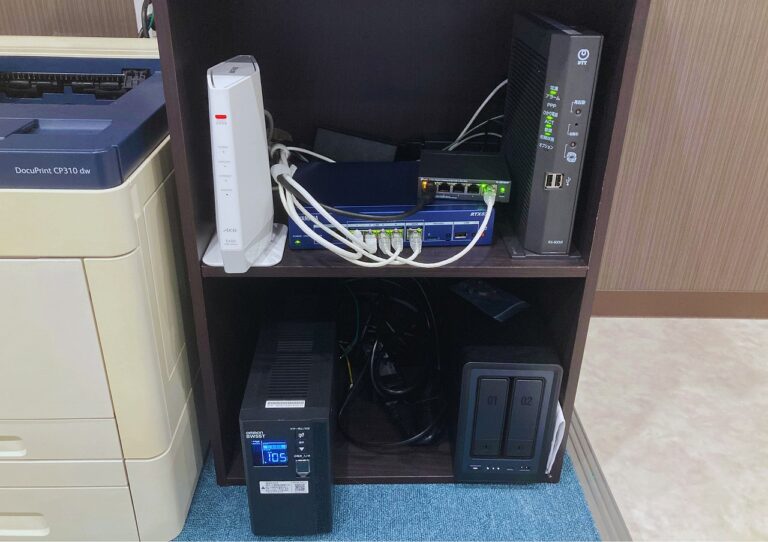 【導入後の成果】 既存の光回線とStarlinkによる冗長化構成を構築。メイン回線の障害時には瞬時にサブ回線へ切り替わります。 さらにマルチホーミングも設定し、2回線を同時に利用して負荷分散を行うことで、通信トラフィックを最適化し、実効速度を向上させています。 また、NASによるデータの一元管理と、UPSによる停電対策も行い、可用性の高い社内ネットワーク環境を実現しました。