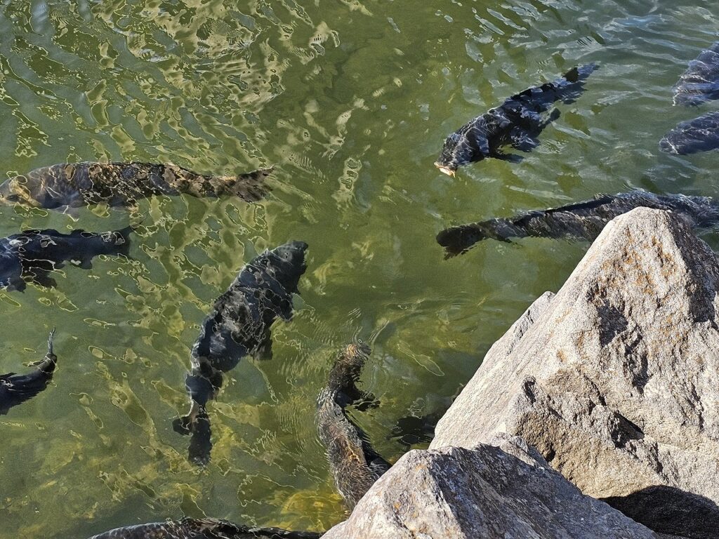 橋の下、岩で囲まれた水面を覗いてみると、そこには鯉たちが優雅に泳ぐ姿が見えました。