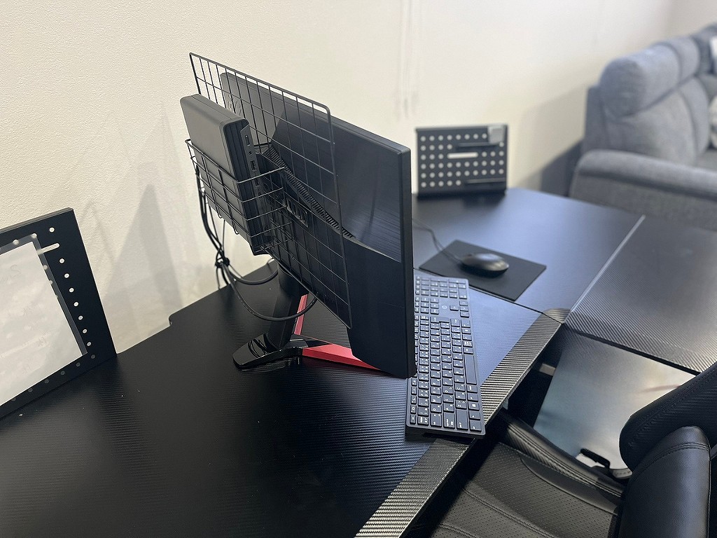 私たちはこれを、液晶モニターの裏側に取り付けて使用することもあります。 こうすると、デスクの上にはモニターとキーボード、マウスしかないので、見た目はまるで「一体型PC」のようにスッキリします。 机のスペースを広く使えるため、書類を広げたり作業をしたりする際も非常に快適です。
